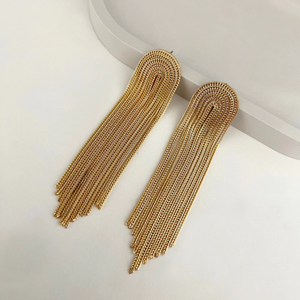 Son aros dorados con base redonda y de ella caen mini cadenas. A pesar de ser aros grandes y llamativos, no son pesados. Pertenecen a nuestra línea de accesorios económicos para fiestas