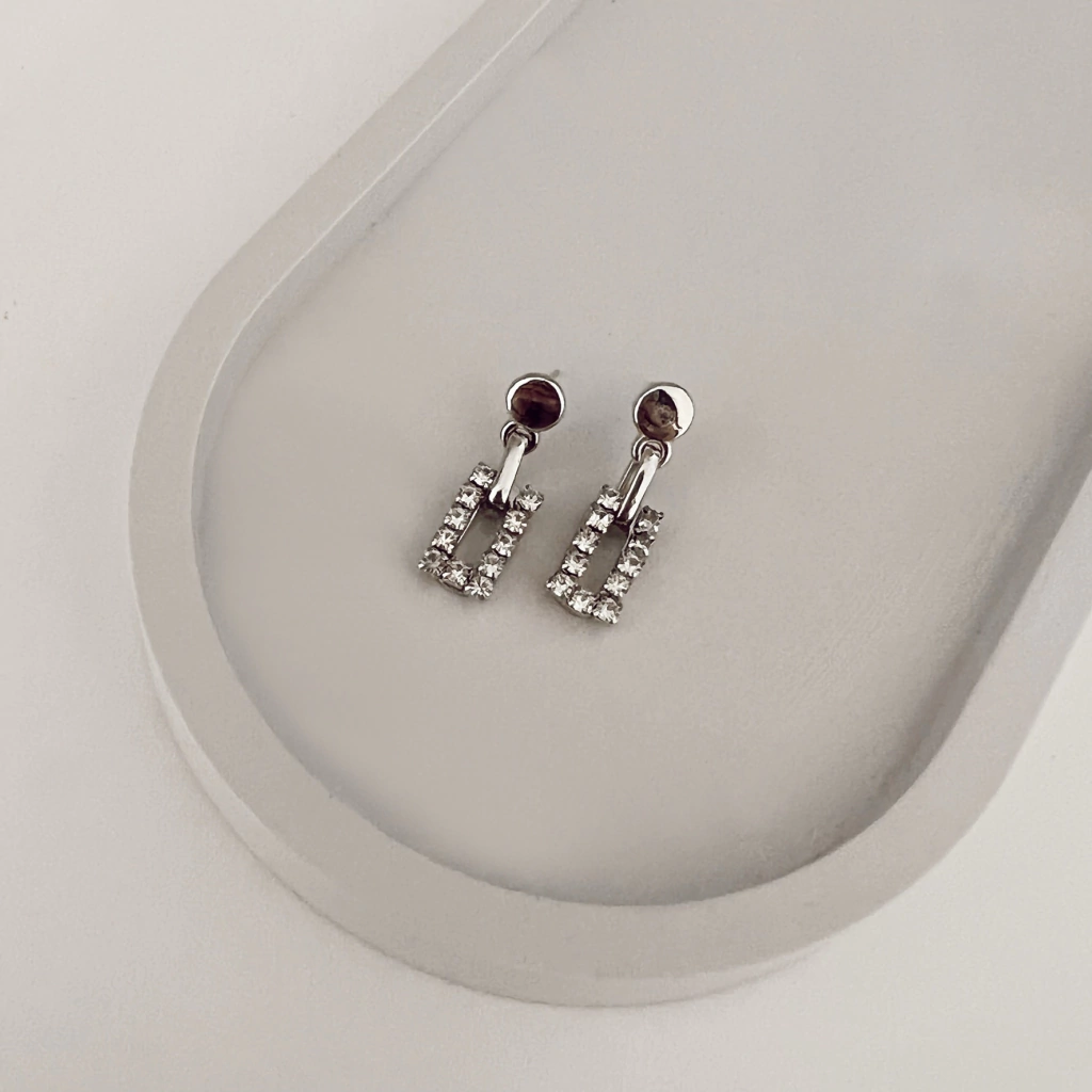 Son aros muy elegantes que combinan su base plateada lisa y su dije colgante en forma de rectángulo cubierto por brillos translúcidos. Pertenecen a nuestra línea de accesorios económicos para fiestas